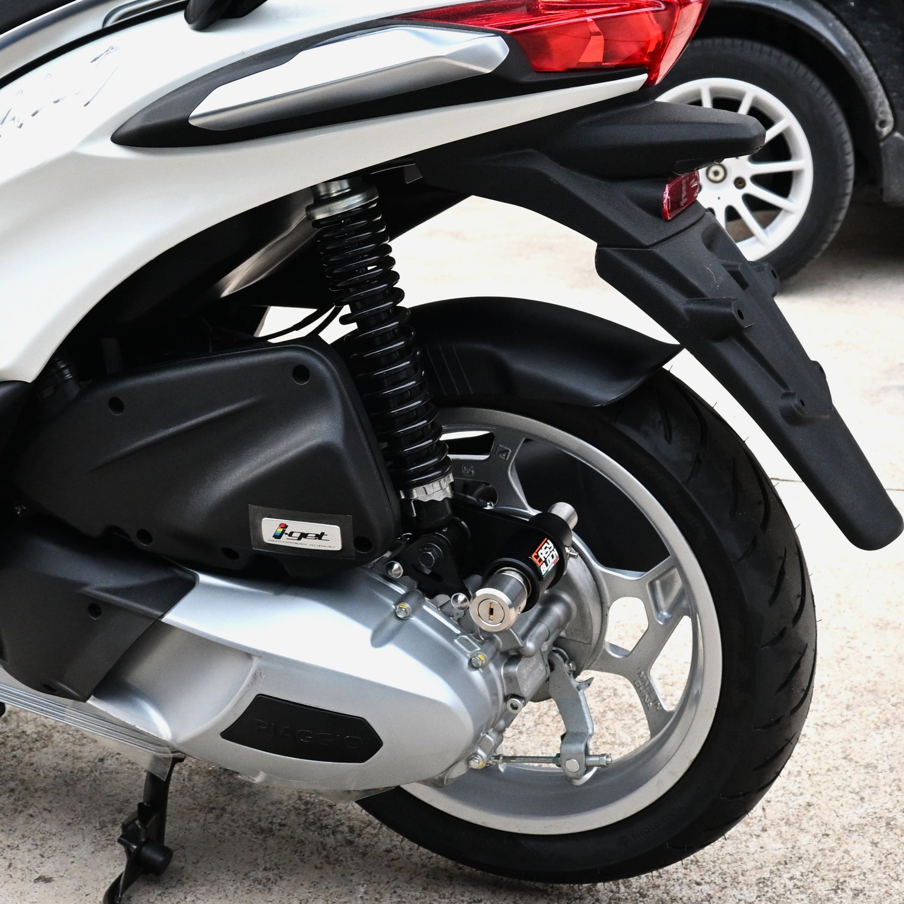 Nella versione per scooter una molla di sicurezza con precarico sul pistone centrale previene l'attivazione accidentale.